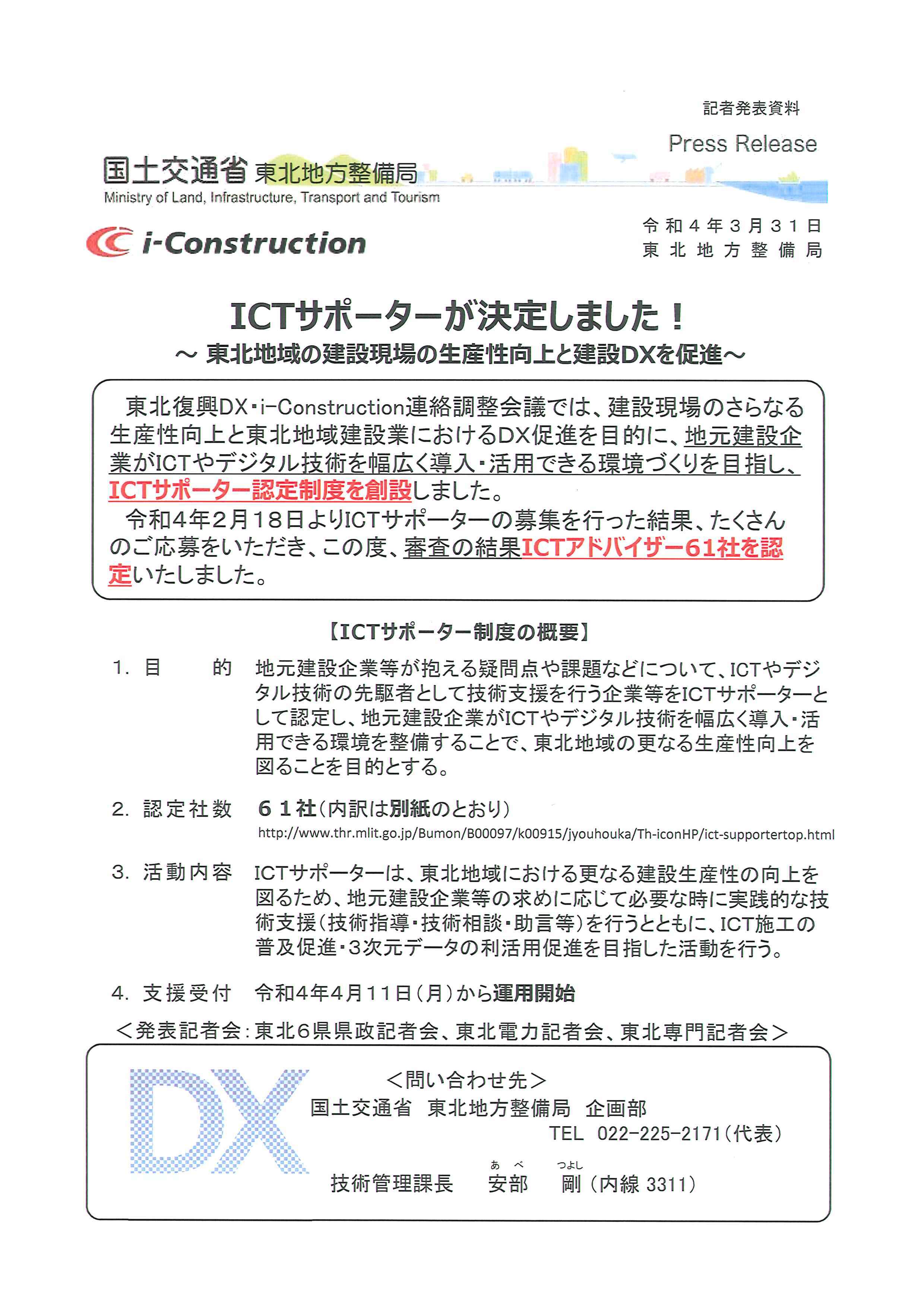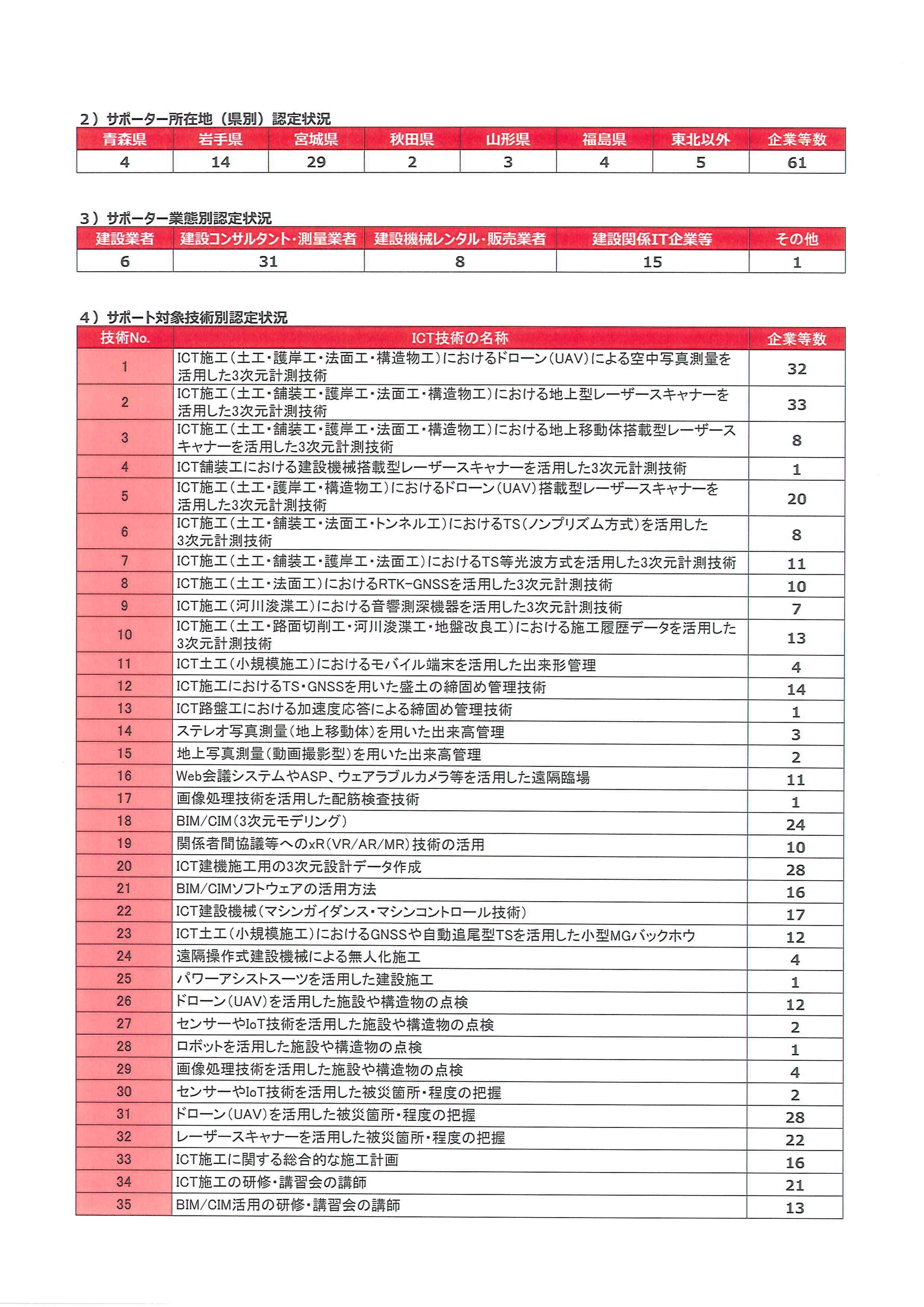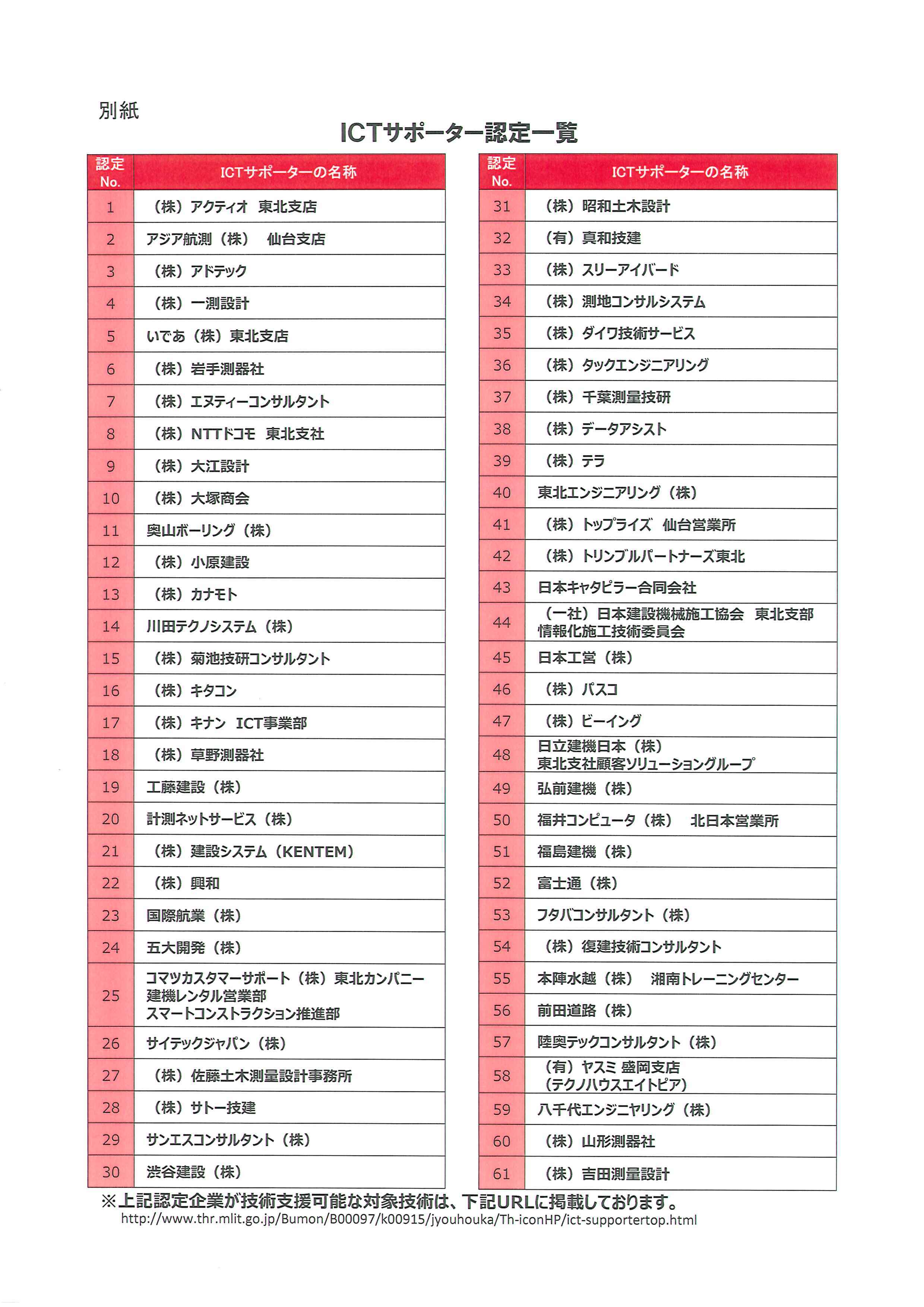 地元建設企業等が抱える疑問点や課題などについて、ICTやデジタル技術の先駆者として技術支援を行う企業等(ICTサポーター)に認定されました。